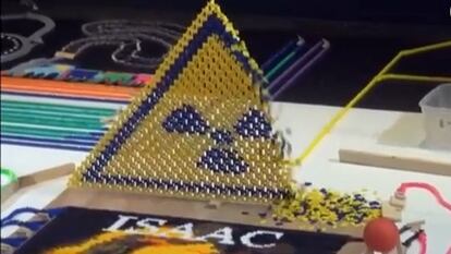 200.000 piezas de dominó, más de 500.000 objetos, entre 400 y 500 reacciones en cadena, 16 constructores trabajando 14 horas diarias durante 10 jornadas... Las cifras impresionan y es que los voluntarios del Centro de Ciencias de Michigan, en Detroit (EE UU), pretendían batir nada menos que una marca mundial. Concretamente el récord Guiness de máquinas de Rube Goldberg, como se conocen los dispositivos en los que una serie de objetos van derribando otros en una reacción en cadena. 300 personas pagaron una entrada para ver en directo el mes pasado lo que muestran las imágenes superiores. Minutos de tensión con un final agridulce. La autodenominada Increíble Máquina de Cienciastuvo algunos fallos. Según su diseñador, Steve Price, el número de fichas de dominó derribadas les garantiza un récord nacional, pero solo alrededor de 200 dispositivos en cadena funcionaron y será necesario esperar a una revisión de las grabaciones. El veredicto, ha dicho Price, podría demorarse mucho tiempo. Mientras tanto, habrá que consolarse con el hipnótico vídeo.