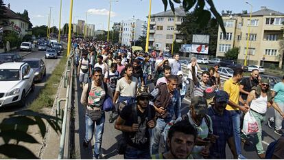Cientos de refugiados parten a pie desde Hungría hacia Austria. Cientos de refugiados que llevaban días varados en Budapest han emprendido este viernes la marcha a pie hacia la frontera con Austria, a casi 200 kilómetros de la capital húngara, ante la imposibilidad de tomar trenes. Austria es el destino deseado por la inmensa mayoría de los que han llegado a Europa en su huida de la guerra. Padres, niños, ancianos, familias enteras caminan en este momento por la autopista húngara M-1 en una marcha que abren los hombres y los más jóvenes. Les siguen familias completas con sus carritos de bebé y su mochilla a la espalda. A falta de idiomas con los que hacerse entender, algunos solo repiten: "Siria; Austria".