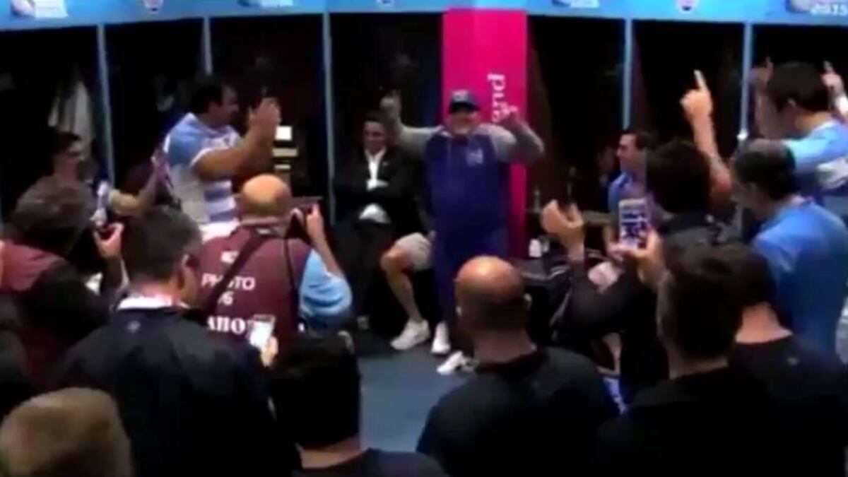 El exfutbolista celebra junto a la selección argentina la victoria ante Tonga en el vestuario