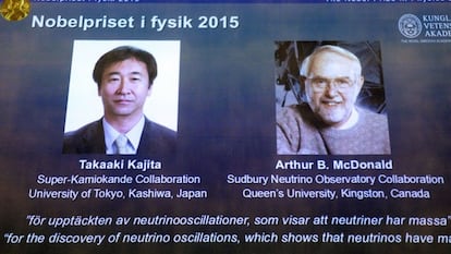 El japonés Takaaki Kajita y el canadiense Arthur McDonald han recibido hoy el Premio Nobel de Física por el descubrimiento de la oscilación de los neutrinos, lo que demuestra que estas partículas tienen masa.