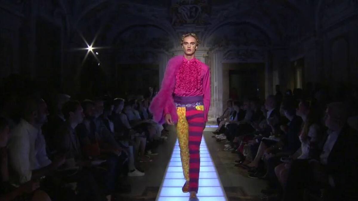 En la pasada edición de la feria Pitti Uomo de Florencia –una de las más influyentes dentro de la moda masculina–, donde acudió como director creativo de Moschino, Scott inventó el resaludo. Una hora después del desfile, irrumpió en la fiesta posterior tocado con corona de oro y piedras falsas –por el aire dieciochesco de la colección– y del brazo de su musa y amiga Katy Perry. Con un lento paso teatral, ambos fueron recorriendo las cuatro esquinas del patio del impactante Palazzo Corsini, en el que se había instalado la pasarela, y arrastrando en el proceso a un enjambre cada vez mayor de groupies, que se descoyuntaban para sacarse fotos con ellos. Es difícil, por no decir imposible, imaginar a otro diseñador en activo en una escena similar.