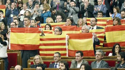 Mas avisa a la CUP de que si no le apoya “el proceso encallará”. El presidente en funciones de la Generalitat ha advertido a la formación anticapitalista, durante el discurso de investidura, de que si no respalda su reelección el proceso soberanista se verá afectado. La CUP ha expresado varias veces su negativa a votarle. “El reto que tenemos [la independencia] es gigantesco. No sobra nadie”, ha señalado Mas. Por la mañana, el Parlamento catalán ha aprobado con 72 votos a favor (Junts pel Sí y la CUP) y 63 en contra (Ciudadanos, Catalunya Sí que Es Pot, PSC y PP) la declaración soberanista para iniciar el proceso de desconexión con España y que implica no acatar las decisiones de “las instituciones del Estado español, en particular del Constitucional”.