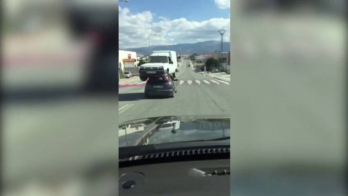 La Guardia Civil busca a dos conductores por cometer una doble imprudencia en el polígono Hontoria, en Segovia. Según muestra el vídeo que ha difundido el portal Zamora News, uno de ellos, que conducía un Ford Focus, llevaba una furgoneta sobre el techo. Al tiempo, el otro conductor le grababa con su teléfono móvil mientras llevaba el vehículo. Ambos podrían ser multados al menos con 500€. El vídeo ha alcanzado en tres días más de 135.000 visitas.