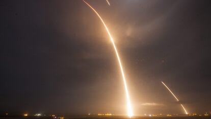 El Falcon9 (el de esta madrugada ha sido el sexto lanzamiento de uno de estos cohetes este año) partió con un día de retraso sobre el plan de vuelo que se había fijado debido a ajustes técnicos de última hora. A los 2.24 minutos del despegue, cuando había alcanzado unos 80 kilómetros de altura y una velocidad de unos 5.850 kilómetros por hora, se separaron la primera y segunda etapa del lanzador: una emprendió el regreso al suelo y la otra continuó el ascenso para poner en órbita los 11 satélites (170 kilos cada uno) de transmisión de datos de la constelación Orbcomm. La primera etapa hizo los reencendidos de motores planeaos para el descenso controlado y cerca del suelo desplegó sus cuatro patas para posarse suavemente en tierra.