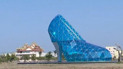 En la década de los 60 del siglo pasado, cuando la escasez de agua asediaba al sur de Taiwán, los habitantes de la zona tenían que perforar pozos profundos para obtenerla. Pero mucha de esta agua contenía arsénico, por lo que algunos taiwaneses enfermaron del llamado pie negro, un mal vascular con síntomas similares a la gangrega y que obliga -en ocasiones graves- a la amputación de las piernas de quien lo padece. Como memoria de las víctimas de la enfermedad que "perdieron la oportunidad de caminar sobre tacones hacia el altar", según Talia Pan, directora de actividades de recreo de la región, se ha construido en la ciudad de Chiayi, al sur de Taiwán, un templo de 17 metros de altura en forma de zapato de tacón. La estructura de metal y cristal azul busca también atraer turistas a la ciudad taiwanesa.