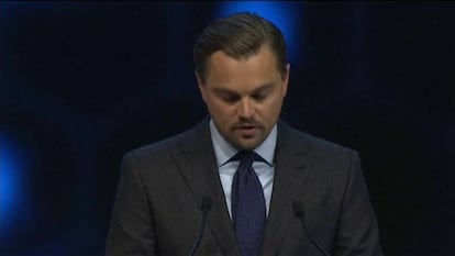 Su lucha contra el cambio climático le ha llevado hasta los glaciares del Ártico y a países africanos, así como a involucrarse en la producción y rodaje de documentales. Incluso ha organizado y participado en subastas para recaudar fondos. El actor aprovechó su discurso, que escucharon, entre otros, el vicepresidente de Estados Unidos, Joe Biden, para instar a los líderes políticos y económicos a cumplir los compromisos para limitar el calentamiento global alcanzados en la Cumbre del Clima celebrada en París el pasado diciembre. “Nuestro planeta no puede ser salvado a menos que dejemos los combustibles fósiles bajo tierra, que es donde pertenecen. Hace 20 años describimos este problema como una adicción, hoy tenemos los medios para poner fin a esta dependencia”, dijo DiCaprio, mensajero de la paz de la ONU.