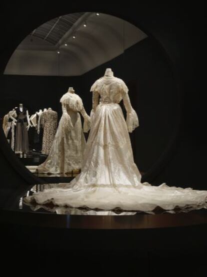 La colección del museo se ha formado gracias a donaciones de los dueños de los vestidos. Monarcas incluidos. Por eso presume de la bata de seda japonesa de Guillermo III de Orange, rey de Inglaterra en el siglo XVII, a la vez que estatúder (gobernador general) de las Provincias Unidas de los Países Bajos. “En su día, era violeta, aunque ahora parece dorada. Imagínese cómo debía imponer con este atuendo intenso y de un tejido excepcional”, apunta la conservadora. En la pasarela solo hay vestidos del siglo XX para que las vibraciones no desprendan los adornos. En una sala contigua, por el contrario, destaca un grupo de piezas a partir de 1800, que evidencian la evolución de la silueta femenina. En particular el corsé, que también abandonó la cintura de avispa. “Se trataba de que ellas caminaran con gracia evitando movimientos bruscos”. A cambio, la hechura era preciosista y los detalles y accesorios interminables.