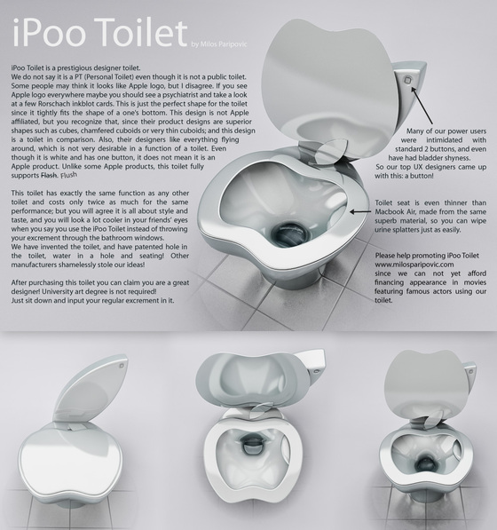 Frente a los baños estándar, “que normalmente son difíciles de usar, muchas veces se atascan y en ocasiones no reconocen su culo”, el diseñador Milos Paripovic propone su iPooToilet, “un retrete que tiene exactamente la misma función que cualquier otro retrete y solo cuesta el doble.” Un guiño malvado a los diseños de Apple y a la Fuente de Duchamp, un urinario convertido en obra de arte.