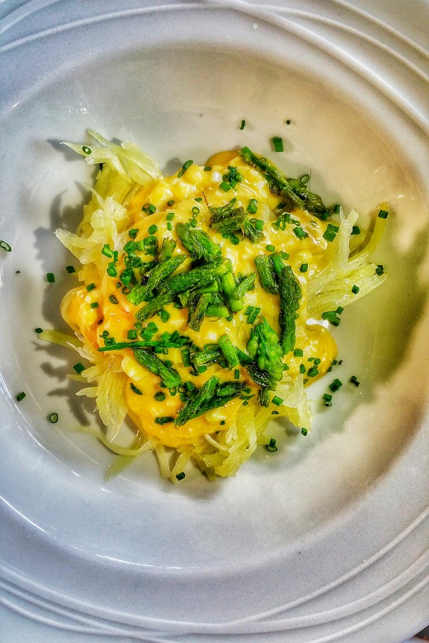 Repartir las patatas en forma de montón. Salsear con la crema y terminar con un poco de cebollino picado y las puntas de los espárragos levemente salteadas.