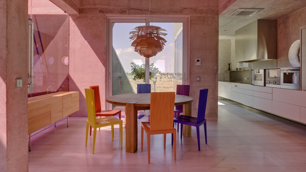 COMO CUANDO abres un higo, el contraste entre el interior y el exterior de esta vivienda es extremo”, explica el arquitecto Javier Peña. Le da la razón el diálogo entre la rusticidad del hormigón externo –preparado para soportar dignamente el paso del tiempo sin recurrir a la pintura ni al mantenimiento– y el interior colorista, transparente y luminoso. Más que la casa del dueño de una pescadería de 40 años y su hijo enclavada en Los Alcázares (Murcia), parece el reino de una piscina que atraviesa la primera planta, organiza la distribución de las habitaciones y se ve desde todas las estancias, convirtiéndose en la auténtica dueña del edificio. Es cierto que su lámina de agua interactúa con los reflejos de los diversos vidrios coloreados, pero lo fundamental es que hace de filtro energético dando lugar a un microclima que logra rebajar la temperatura del verano. Javier Peña, que dirige el estudio Xpiral en Murcia, habla de un espacio que sirve como refugio para aislarse del demoledor paisaje posburbuja que ha colonizado el Mar Menor.