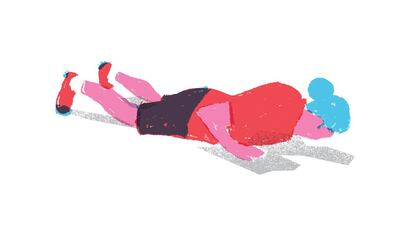 Túmbese bocabajo y apóyese sobre la tripa y las puntas de los pies. Extienda los brazos por encima de su cabeza y, sin tocar con ellos el suelo, flexiónelos llevando los codos hacia las caderas. Vuelva a estirarlos.
