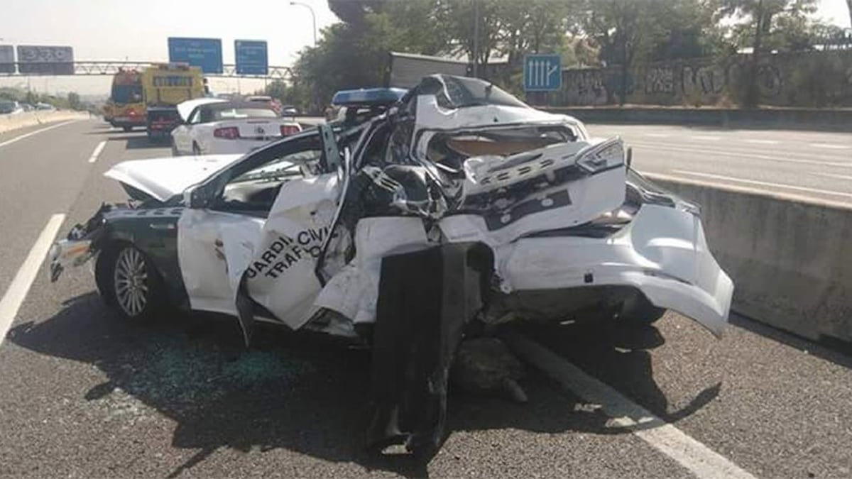 El conductor de un autobús procedente de Alpedrete (Madrid) no esperaba encontrarse este lunes a un coche de la Guardia Civil estacionado en el arcén del carril BUS-VAO de la A-6. En torno a las 12 del mediodía, unos agentes asistían al conductor de un Ford Mustang averiado cuando el autobús embistió contra su coche. Como si de fichas de dominó se trataran, el coche patrulla salió despedido y chocó con el vehículo averiado, como puede verse en el vídeo de las cámaras de la DGT. Quince de los pasajeros del autobús resultaron heridos.