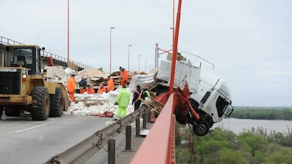 Un camión cuelga ocho horas del puente más grande de Argentina