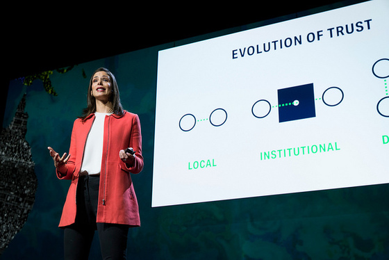 En su charla Botsman explica que la confianza ha evolucionado a lo largo de la historia. Primero era de ámbito local y se construía a través de relaciones estrechas. En el siglo XIX la confianza fue depositada en las instituciones, que no nos conocen, y con las que firmamos contratos y regulaciones. Y en el siglo XXI nos estamos dando cuenta de que la confianza en las instituciones ya no funciona para la era digital. Lo institucional es opaco, cerrado, centralizado, requiere autorización y va de arriba hacia abajo. Mientras que la confianza distruibida es transparente, inclusiva, descentralizada, rinde cuentas y va de abajo hacia arriba.