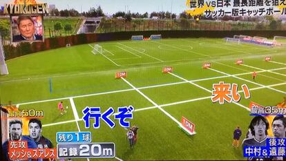 Catchball. Así ha apodado la televisión japonesa al juego al que Messi y Suárez, jugadores del Barça, han practicado en un programa nipón. Se trata de lanzarse la pelota el uno al otro lo más lejos posible sin que esta toque el suelo. El argentino y el uruguayo han conseguido pasarse el balón a 56 metros de distancia, mientras sus contrincantes, los japoneses Shunsuke Nakamura y Yasuhito Endo, se quedaron en los 50 metros. No es la primera vez que un jugador del FC Barcelona aparece en la tele nipona. Messi y Suárez ya aparecieron en ediciones pasadas del mismo programa tratando de derribar un dron con la pelota.
