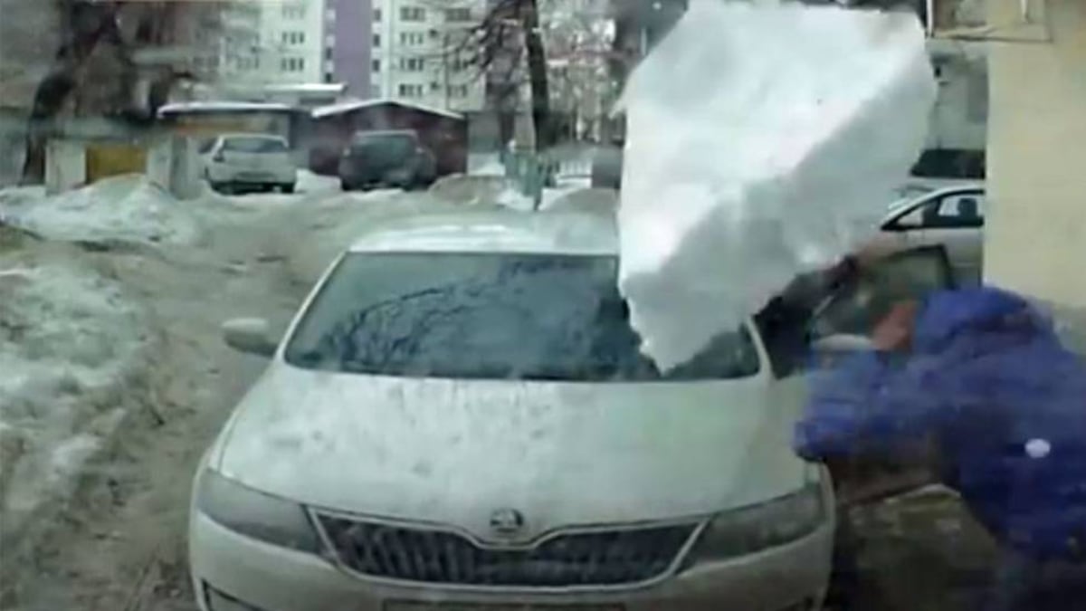 Un bloque de hielo cae de un tejado y destroza un coche en Rusia