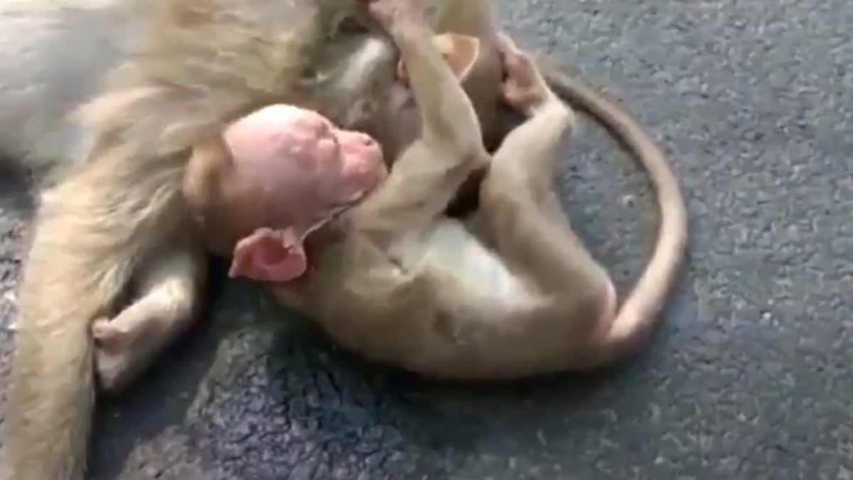Una cría de mono llora desconsoladamente la muerte de su madre