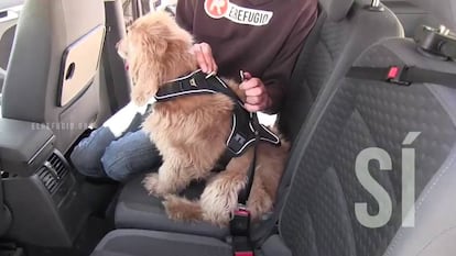¿Y en los asientos delanteros? No, siempre en los traseros y, atención, sujeto con un arnés distinto del que tú crees. “Si el arnés es de un solo enganche, en caso de colisión la anilla podría romperse. Lo óptimo es utilizar uno de doble enganche, y fijarlo a los anclajes de dos cinturones de seguridad”, precisa Paunero. De esta manera, el perro no se desplazaría en caso de choque y no se golpearía con los asientos delanteros.