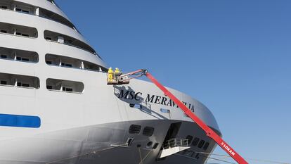 Finales de marzo de 2017. La terraza de la cubierta donde estas señoras saborearán su ansiado cóctel es un auténtico caos. Un enjambre de cables, sacos de cemento, tablas de madera y muebles sin colocar. Miles de operarios trabajan a pleno rendimiento para rematar las obras del Meraviglia. Esta megaconstrucción naval de 315 metros de eslora, 43 metros de manga y 65 de alto se ha levantado en uno de los diques del astillero de Saint-Nazaire, en la Bretaña francesa. Los altavoces del buque repiten la misma frase cada cinco minutos: “Attention: un, deux, trois, quatre”. Las pruebas de sonido no parecen molestar a los pintores, carpinteros, electricistas, ingenieros, operarios de grúa, fontaneros y demás empleados que trabajaban en las obras. En la galería central, que albergará restaurantes, tiendas de lujo y diferentes bares, se escuchan una decena de taladros agujereando al unísono, acompañados por el estruendo de las lijadoras y los gritos del compañero del andamio pidiendo más pintura. Aquí lo único realmente acabado es el techo, cubierto por una pantalla gigante de luz led que recreará un cielo digital. De música de fondo, reguetón. Ritmo bien duro para cumplir con el plazo de entrega: el 31 de mayo. Lo que sí está ya instalado es la escalinata de cristales de Swarovski de la recepción. Cualquier excentricidad es poca en la pugna para proclamarse el auténtico rey de los mares y atraer al mayor número de cruceristas. Un tipo de viajero que demanda mucha diversión a bordo, que quiere visitar diferentes ciudades sin tener que acarrear maletas y pagar precios asequibles.