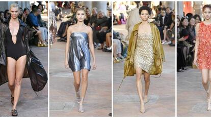 Poco a poco, y sobre ellos, comienzan a aparecer gabardinas y chaquetas de cortes rectos y, por fin, los vestidos. Arrancan siendo una suerte de pareos y evolucionan hasta llegar a sus clásicas piezas vaporosas. Las prendas de sencilla viscosa dan paso al punto y materiales más complejos de trabajar como las plumas y las lentejuelas, que conforman trajes, shorts y minifaldas. Los tejidos metalizados en colores pastel definen la última parte de la presentación con camisas anudadas al ombligo, vestidos lenceros y pantalones sastre.