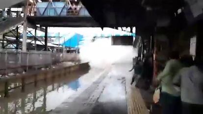Un grupo de pasajeros que esperaban el tren en India no han podido evitar acabar empapados a pesar de ir equipados con chubasqueros y paraguas. El convoy que estaba a punto de pasar por la estación de Nala Sopara, cerca de Bombay, no iba a parar, pero las personas que esperaban no lo sabían. No se separaron lo suficiente de las vías, a pesar de que estas estaban completamente inundadas después de las lluvias torrenciales que han sacudido estos días la región. El tren no paró, y provocó una gigantesca ola que empapó a todo el mundo.