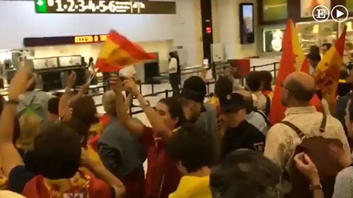 Varias decenas de personas, al encontrárselo en la estación, han comenzado a silbar a Iglesias, que participó este sábado en el programa FAQde TV3, pasaba el control de seguridad de la estación de tren. "¡Fuera, fuera!", le ha increpado un grupo de pasajeros que acababan de llegar en un AVE a Barcelona al verle en el control de seguridad de la estación ferroviaria cuando se disponía a tomar un tren para regresar a Madrid. Sin dejar de ondear sus banderas, los manifestantes han lanzado sus gritos contra Iglesias mientras el diputado dejaba su mochila en el escáner y saludaba a los vigilantes de seguridad.