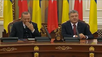 Una de las imágenes que se ha hecho más viral en las redes sociales esta semana es la del presidente de Turquía, Recep Tayyip Erdogan, echando una cabezada durante una rueda prensa. La escena se produjo el pasado lunes, cuando comparecía ante los medios junto a su homólogo ucranio Piotr Poreshenko, en la visita oficial del dirigente turco a Kiev. Un periodista del canal Kurdistan 24 compartió el vídeo en su cuenta de Twitter y obtuvo miles de retuits, además de decenas de memes en Turquía.