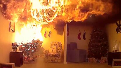 El Gobierno de Estados Unidos ha lanzado una campaña para evitar el incendio del árbol de Navidad en los hogares. Se trata de un sencillo consejo que la Comisión para la Seguridad de los Productos de Consumo da todos los años por estas fechas: no dejar que el árbol se seque. El organismo alerta sobre los peligros de no regarlo y lo hace con un experimento: una comparativa entre dos árboles en los que se origina un pequeño fuego. El primero, un árbol húmedo, resiste y las llamas no prosperan, pero el segundo no corre la misma suerte. La agencia estadounidense también aconseja elegir el árbol más fresco posible, situarlo en casa lejos de fuentes de calor o comprobar que el alumbrado cumpla con los certificados de seguridad.