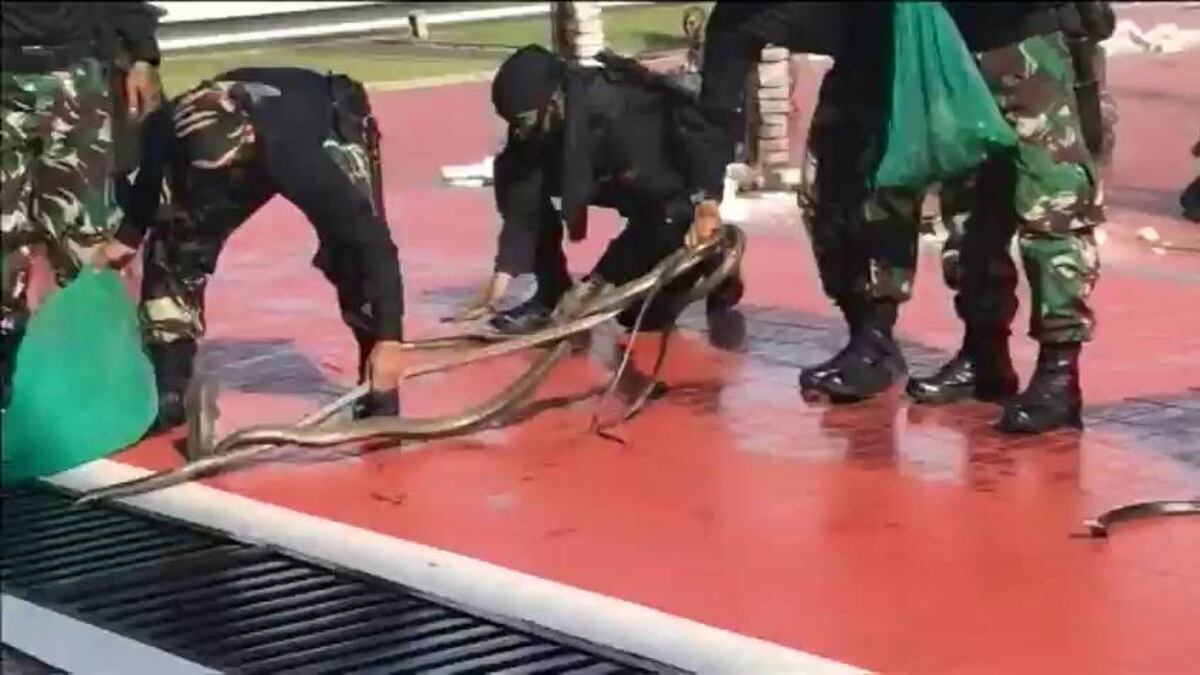 Serpientes vivas, entre ellas una cobra participan en la exhibición militar de soldados indonesios, en honor a un destacado espectador, nada menos que el secretario de Defensa de los Estados Unidos. Jim Mattis, de visita en Indonesia, ha presenciado cómo estos soldados están entrenados para andar sobre fuego ó para partir bloques de piedra. Una singular exhibición que terminó con un simulacro más rutinario, el de secuestro y liberación de rehenes.