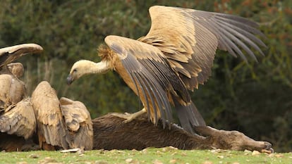 El problema es conocido en Portugal, asegura Joaquim Teodósio, un portavoz de la ONG conservacionista portuguesa SPEA, filial de BirdLife International. “Todas las colonias grandes de buitres [en Portugal] están cerca de la frontera con España y es posible apreciar que casi todos campean en el lado español”, explica Teodósio. Su organización, junto con la Dirección General de Alimentación y Veterinaria (DGAV) y el Instituto de Conservación de Bosques y Naturaleza (ICNF, por sus siglas en portugués), están colaborando para solventar la escasez de carroña en el país. “Podrían implementarse áreas cerradas en las que dejar los cadáveres o incluso conceder permisos a granjas para abandonar el ganado muerto en zonas de campo autorizadas”, sugiere Teodósio. Además de contribuir a la conservación de las poblaciones de buitres, estas medidas paliarían el considerable coste —económico y medioambiental— de recoger los animales muertos, transportarlos y deshacerse de ellos.
