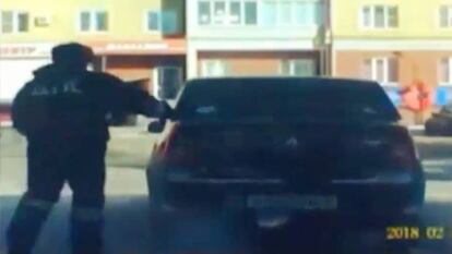 Un policía ha frustrado la huida de un joven de 20 años a bordo de un coche robado en la ciudad rusa de Tiumén. El agente, Maxim Mamaev, se abalanzó sobre el vehículo después de que el ladrón se diera a la fuga en pleno registro policial el pasado 16 de febrero. Mamaev se agarró al maletero, rompió la luna trasera del vehículo con su arma y se introdujo en el interior del automóvil, un Renault Logan, desbaratando los planes del caco. El conductor aumentó su ya abultado historial de antecedentes penales, dando positivo en el control de alcoholemia y con su malograda huida, grabada por la cámara interna del coche policial.