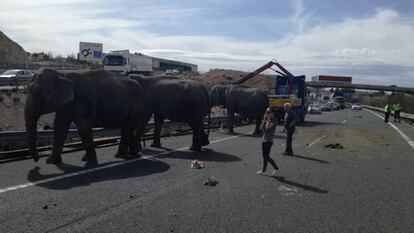 A circus truck carrying five elephants overturned on Monday on the A-30 highway in Pozo Cañada in Albacete, leaving one of the animals dead and two seriously injured. The driver was unharmed. The accident occurred at 2.24pm when the truck tried to overtake a car traveling at low speed, the local Albacete police force and Town Hall explained in a message on Twitter. As the circus vehicle sped up to enter the other lane, it tipped over – likely due to the uneven weight distribution and the movement of the elephants, said sources from Spain’s DGT highway authority.