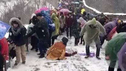 La Gran Muralla China es el monumento más visitado en todo el mundo, recibe a unos 50 millones de turistas al año y cuenta con casi 9.000 kilómetros de longitud, pero tras los primeros copos de nieve de 2018, se ha convertido en un lugar impracticable para muchos visitantes. El pasado 17 de marzo, numerosos turistas se vieron sorprendidos por la nieve y fueron incapaces de mantener el equilibrio en la parte de la Muralla más cercana a Pekín. Una secuencia grabada por un visitante muestra el resbaladizo estado de la superficie, que al estar cubierta de hielo y nieve, se convierte en un improvisado tobogán para los presentes.