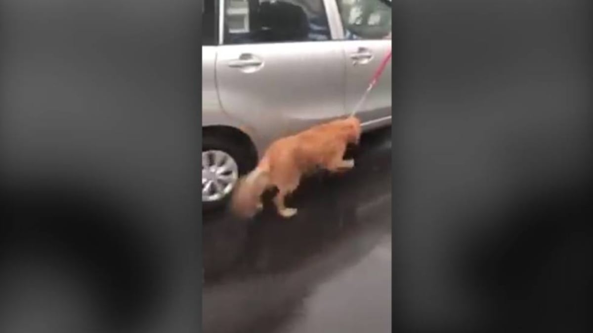 Un perro es atado a un coche en marcha bajo la lluvia por su dueño