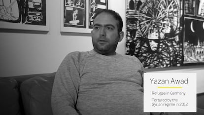 Awad is a big guy; a 30-year-old who sought refuge in Germany two years ago after being imprisoned in the al-Mezzeh airport – which was under control of the Syrian military air force – for 137 days. “As soon as I arrived, they beat me for six hours. They lay us on the ground and beat us with pipes. They beat the soles of our feet. Then they put me in a cell with 180 people. The pain was terrible. I couldn’t go to the toilet. Two people had to drag me there.”