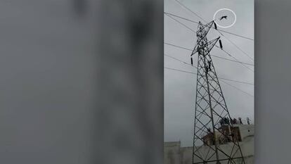 Un mono salta al vacío desde una torre de alta tensión para salvarse la vida