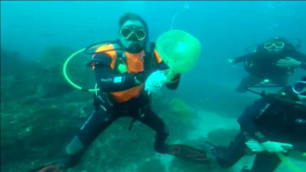 Un submarinista español libera a un tiburón que estaba tragándose una bolsa de plástico