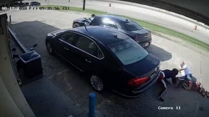 Dos hombres han sido detenidos tras protagonizar un violento intento de robo en el estado de Texas (EE UU). La víctima ha sido una mujer que se disponía a entrar a su casa con 75.000 dólares recién sacados de banco en el bolso. Las imágenes captadas por una cámara de seguridad demuestran la agónica lucha entre ella y los ladrones: uno de ellos se queda en el coche esperando a que su compañero realice el atraco, pero la mujer se aferra a su bolso con tal fiereza, que el atacante no es capaz de llevarse el botín. El ladrón le propina puñetazos y patadas hasta que aparece el marido de la víctima, quien también intenta, sin éxito, alejar al atacante con golpes e interponiéndose entre ambos. Es entonces cuando el cómplice decide intervenir en la pelea, pero cuando ve que siguen sin conseguir el botín, decide meterse en el coche para atropellar marcha atrás a la pareja, dejando a la mujer gravemente herida. A pesar de sus intentos por quedarse con el dinero, acaban marchándose sin el premio.