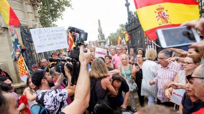 The demonstration on Wednesday evening was attended by around 600 people, according to the Catalan regional police, the Mossos d’Esquadra, while Ciudadanos put the figure at a thousand. Many of those who attended carried the Spanish flag and banners with messages such as “Freedom,” and “The streets are for everyone,” as well as “I am Spanish,” and “Puigdemont to prison,” in reference to the ousted Catalan leader Carles Puigdemont, who fled Spain to Brussels to avoid facing charges for his involvement in the independence drive.
