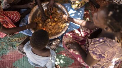 Hoy toca comer. Cuando la penuria aprieta suele aparecer algún vecino con un trocito de pescado seco, un puñado de arroz o unas verduras que echar a la olla. Mientras Aissata se encarga de controlar el caldero, Khadijatou excava con una pala un agujero en la tierra que servirá para instalar una letrina que mejorará la higiene y evitará enfermedades a los pequeños. Por la tarde, la matrona Halimata Niang aparece con su cuaderno de dibujos contra la malnutrición. Sentadas en cuatro alfombras a la sombra de una casa de barro, Khadijatou Mory sigue todo con atención. “¿Qué debe comer un niño hasta los seis meses?”, pregunta Niang. “Solo leche materna”, responde una mamá. “¿Y por qué?”, repregunta la matrona. Ante el silencio general añade: “Porque el pecho no es solo una vacuna para el bebé y evita que se ponga enfermo, sino porque es una manera de evitar embarazos muy seguidos”.