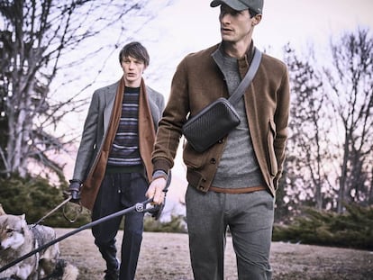 4. Este bolso de fin de semana Hogan es deportivo, funcional y lujoso, igual que las célebres sneakers de la casa italiana. Fíjese en la banda de piel a rayas, en su ligera construcción sin armar y en el brillo sutil que le proporciona su tejido técnico. Pantalón Ermenegildo Zegna y jersey H&M.