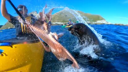 Lo que parecía un día normal en las costas de Nueva Zelanda para un grupo de amigos que disfrutaban de un día de relax a bordo de sus kayaks, se ha convertido en uno de los vídeos más virales del momento. Cuando se cruzaron en la pugna de una foca para conseguir cazar a un pulpo, uno de los kayakistas, Kyle Mulinder, se vio sorprendido por la lucha.