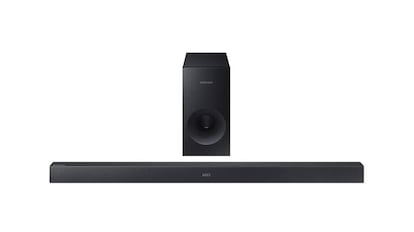 - Barra de sonido inalámbrica Samsung HW-K360. El sonido equilibrado de este modelo genera una experiencia nueva a la hora de ver los deportes o el cine en la televisión. Incluye un subwoofer para generar unos bajos potentes, más graves y de mejor calidad. Con la aplicación Samsung Audio Remote, se puede controlar y ecualizar la barra de sonido desde el móvil, así como reproducir música desde el teléfono. Además, está configurado para conectarse con dos altavoces traseros que generen un sistema de sonido envolvente de 4.1 canales. En ebay tiene un precio de 99,90 euros, inferior al de tiendas como Amazon (118, 40 euros), PcComponentes (139,95 euros) o Carrefour (149 euros). 49% de descuento, ahorra 99 euros.