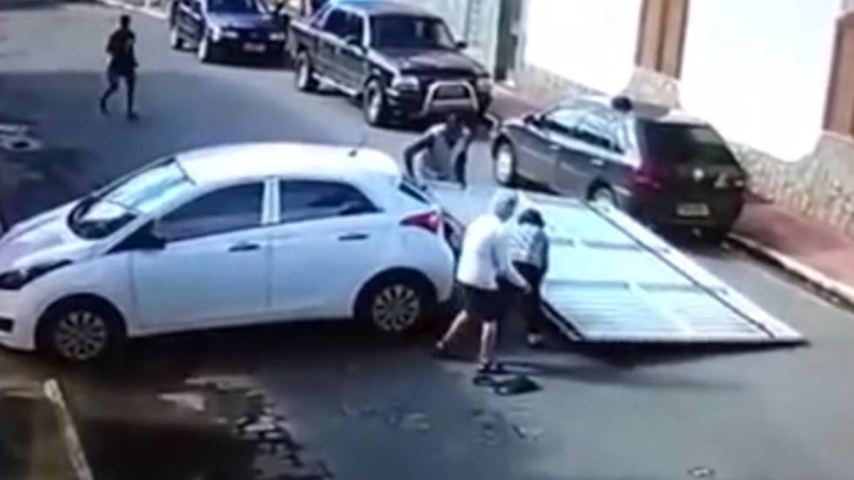 Una cámara de seguridad grabó esta semana cómo un vehículo sin conductor perdía el control y tiraba la puerta de un garaje, de unos 70 kilogramos, que cayó sobre una pareja de jubilados. El accidente se registró este domingo en Río de Janeiro, Brasil, donde la Policía investiga las causas del suceso. La mujer consiguió zafarse de la estructura y con la ayuda de unos vecinos rescató a su marido, de 74 años. Ambas personas presentaron heridas leves, según informa Daily Mail.