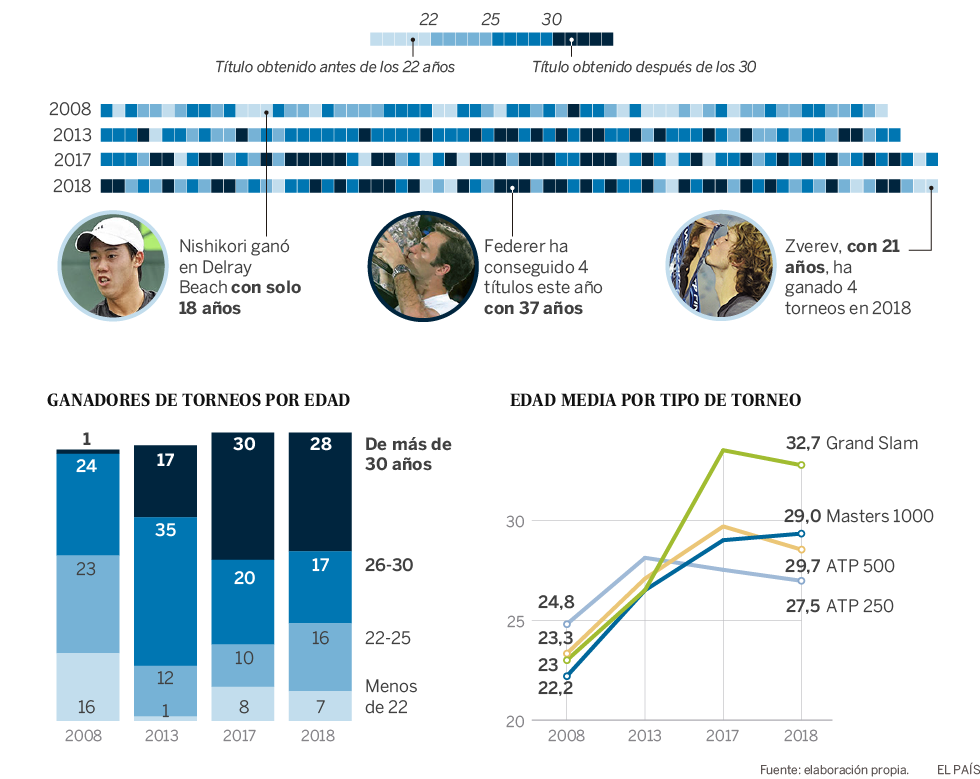 En la última década, la edad de los ganadores en torneos del circuito ATP se ha disparado. En 2008 la media de edad de todos los ganadores era de poco más de 23 años, mientras que en 2018 la cifra se ha acercado a los 30 años (29,4). En cifras absolutas, hace una década solo un tenista mayor de 30 años ganó un título ATP, mientras que en este año, 28 torneos han sido ganados por tenistas que superan la treintena.