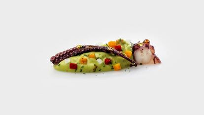 – Picar la cebolleta, los pimientos y la cabeza del pulpo en cuadrados de 0,5×0,5 centímetros. Reservar. Pelar los aguacates y retirar el hueso. Triturar con el aceite y el jugo del limón y mezclar suavemente con el resto de ingredientes. Poner a punto de sal.
