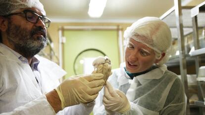 El martes, Bonet visitó el Centro Nacional de Biotecnología (CNB), en Madrid, para conocer por primera vez a su avatar roedor. “¡Ay! ¡Me ha mordido uno!”, exclama la técnica del animalario mientras maneja un grupo de ratones modificados genéticamente. “Será el que tiene mi mutación, porque somos peleones”, bromea Bonet. “Fíjate en que tiene un color muy blanquecino, pero no es exactamente blanco”, apunta el investigador catalán, señalando a un ratón sin la letra C en el gen SLC45A2. “Y tiene rosadas las patitas”, añade la actriz.