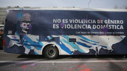 “It’s not gender violence, it’s domestic violence” is the main message plastered on the bus. “Gender laws discriminate against men. Casado, Rivera, Abascal: Repeal the gender laws,” is written below.