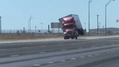 Las fuertes rachas de viento han hecho estragos en los vehículos que circulaban cerca de Amarillo, en el norte de Texas. Los vendavales de más de 120km/h han derribado al menos dos vehículos en una carretera texana. Un fotógrafo, Blake Brown captó con su cámara la caída de un gran tráiler de 18 ruedas que quedó completamente volcado sobre la vía y de un camión de una empresa de transportes. El primer vehículo cayó cuando no había apenas tráfico, sin embargo el segundo a punto estuvo de llevarse por delante un turismo tal y como se aprecia en el vídeo.