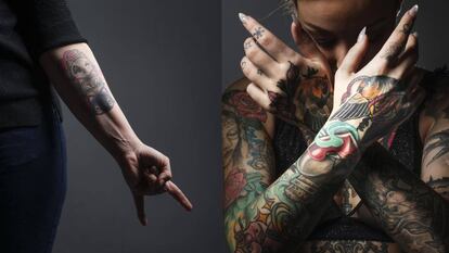 “El primer día que visité el estudio de Debora estaba tan nerviosa que ni recuerdo de qué hablamos”, confiesa la salmantina Celia Hernández, de 34 años. Debora es Debora Cherrys, una de las mejores artistas que hay en la actualidad en España, con sede en La Mujer Barbuda de Getafe (Madrid). Hernández trabaja desde el pasado verano como mánager de ese estudio (encargada, entre otras tareas, de recibir a los clientes). Debora Cherrys es un referente del estilo neotradicional. Entre sus piezas más características destacan las representaciones de coloridos rostros femeninos. “Es superminuciosa. No es solo que dibuje genial, es que pasa el tiempo y el color de sus tatuajes sigue intacto”, defiende Hernández, al tiempo que muestra el dorso de sus manos, donde se pueden ver sendos pájaros naranjas, uno libre y el otro atado. “Cada caso es diferente, pero por norma general los clientes me dan la idea o me cuentan lo que quieren representar, y yo pido total libertad para hacer mi interpretación personal. Creo que es muy importante que el cliente comprenda que, si ha elegido a un artista concreto porque le gusta su trabajo, tiene que confiar en él y entender que su único interés es hacer con su idea el mejor tatuaje posible”, responde por correo electrónico Debora Cherrys.